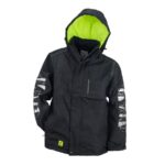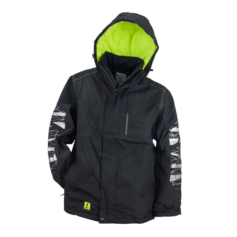 Jachetă de iarnă pentru bărbați cu glugă detașabilă. Are numeroase buzunare: 2 buzunare inferioare și 1 pe piept. Toate buzunarele sunt prevăzute cu fermoare. Pe mâneci se află benzi cu scai pentru reglarea lățimii.