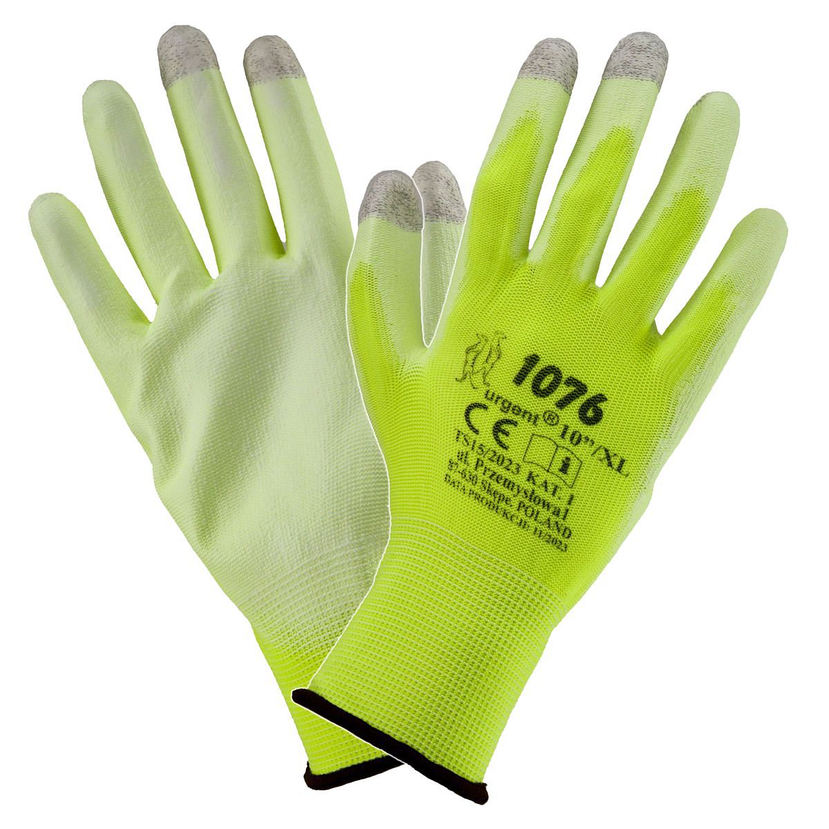 Caracteristică Mănușă confecționată din poliester, acoperită 3/4 cu poliuretan aspru, vârfurile a trei degete tricotate cu strat de carbon.